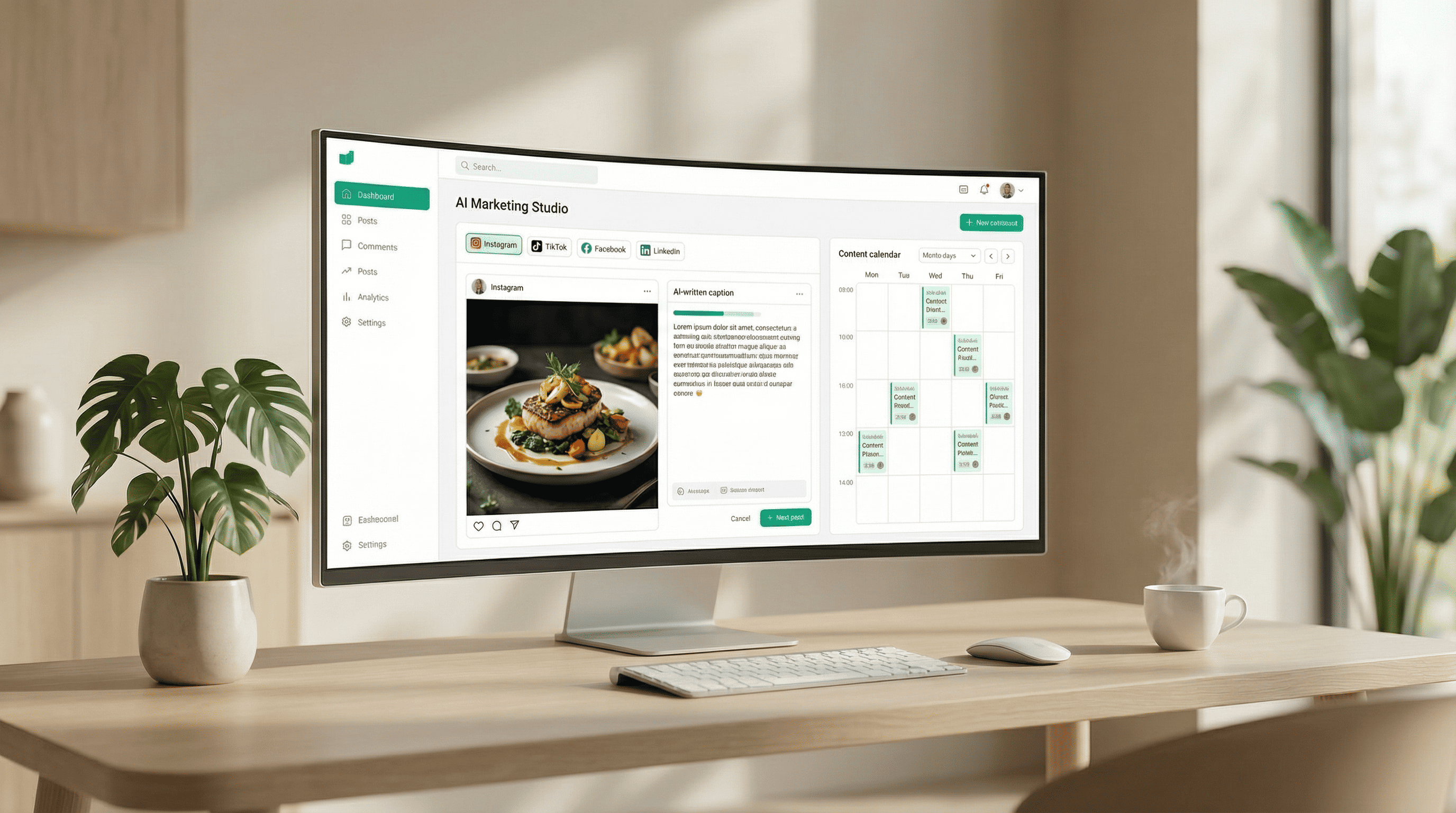 Generate content and push it to Instagram, TikTok, Facebook, LinkedIn, and more — all from one seamless workflow. Every post is automatically optimized for the platform's best practices and dimensions, so you never have to manually resize or reformat again.